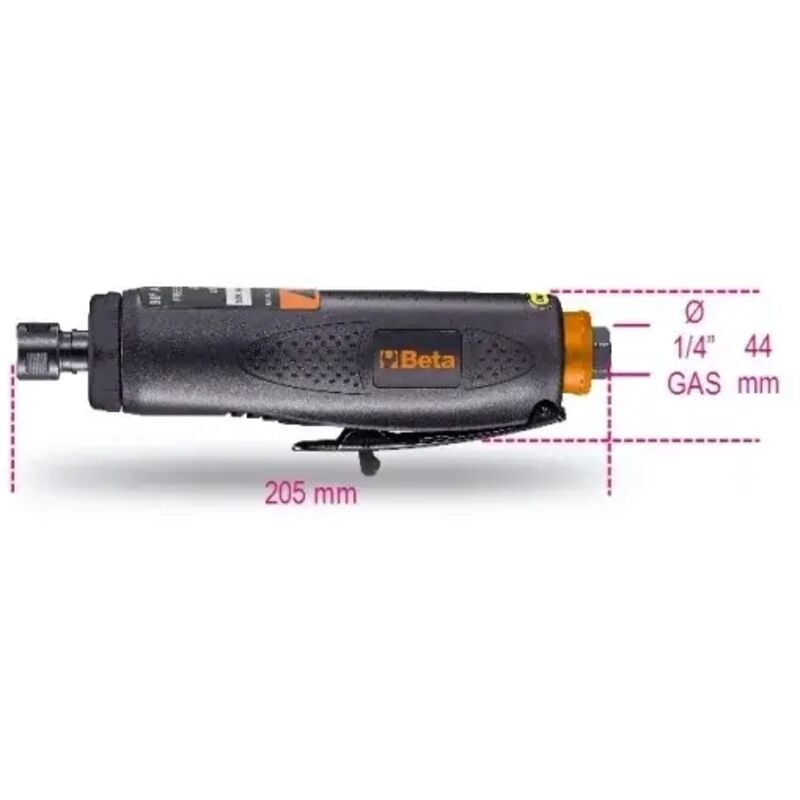 La smerigliatrice assiale pneumatica Beta 1933IH è estremamente compatta e maneggevole pertanto adatta per l'utilizzo in spazi ristretti.Questa smerigliatrice ad alta potenza è fornita con pinze da 3 e 6 mm. Alimentazione: Aria Potenza: 0,75 Kw Tipologia: Smerigliatrice assiale alta potenza Pinza fornita: 3 - 6 mm Capacità massima pinza: 6,0 mm Velocità a vuoto: 20.000 g/min Attacco aria: 1/4 Diametro interno tubo aria: 10,0 mm Consumo aria medio: 370 l/min Utilizzo: Carpenteria, officina, automotive Dimensione: 205 mm Peso: 0,80 Kg Valigetta: No