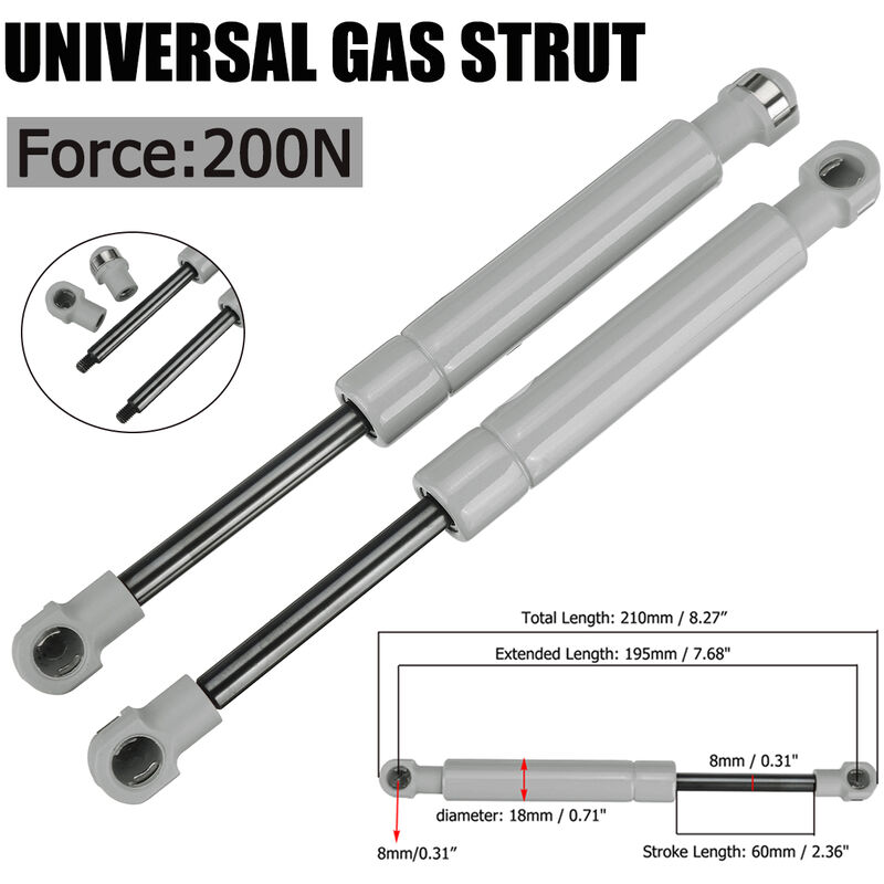 Diametro stelo: 18 mm/0,71" Diametro stelo pistone: 8mm / 0.31" Tipo: modanature interne Colore: grigio Materiale: acciaio inossidabile Modello compatibile: universale Quantità: 2 pezzi Compatibilità: Coppia di molle a gas universali multi-fit, ideali per kit auto, progetti di ricostruzione e conversioni di molle a gas. Adatto anche per boccaporti di barche, roulotte e molte altre applicazioni. Caratteristiche: --100% nuovo. --Acciaio di alta qualità, antiruggine, molto resistente. --Si consiglia l'installazione professionale. Nota: 1. Forniamo immagini chiare, misurazioni