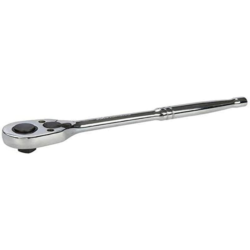 Impugnatura a cricchetto reversibile in cromo vanadio on meccanismo a sgancio rapido e interruttore ad azione con il pollice. Impugnatura ergonomica per un uso confortevole. Fatto conformemente alla norma DIN 3122