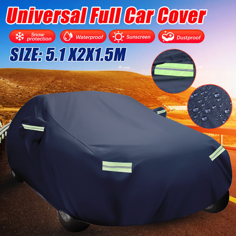 5,1 x 2 x 1,5 m Copertura completa universale per auto, impermeabile, antipolvere, resistente ai raggi UV, all'aperto, per tutte le condizioni atmosferiche Specifica: Condizione: 100% nuovo di zecca Numero di modello: G46212 Nome prodotto: copertura completa per auto Materiale: taffetà di poliestere 210T Colore: blu intenso Strisce riflettenti: 6 pezzi Cinturino: 4 pezzi Numero di strati: 1 Dimensioni: 5,1 m/200,78 pollici x 2 m/78,74 pollici x 1,5 m/59,05 pollici (L x P x A) Tipo: copertura per auto Caratteristiche: -Design impermeabile, antigraffio, anti-ultravioletto, protezione specchietto retrovisore. -Le strisce riflettenti garantiscono la sicurezza durante la notte. -Viene fornito con 4 cinghie per stabilizzare la copertura dell'auto dall'essere spazzata via dal vento. -Il fondo elastico è vicino al fondo del veicolo. -Il tessuto traspirante consente una buona circolazione dell'aria sotto il rivestimento, previene l'umidità e riduce l'accumulo di calore. -La copertura completa