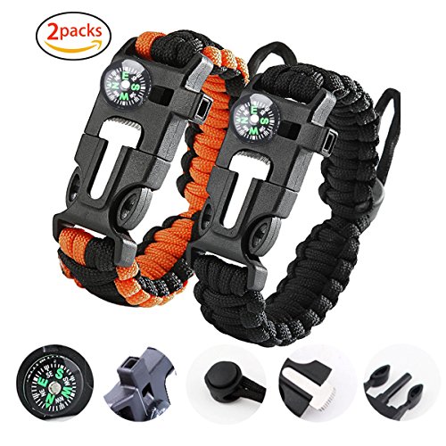 2-Pack - Bracciale Sopravvivenza, Sporteed Bracciale Paracord Regolabile di Fuoco Raschiatore Bussola Fischio per L'escursione del Campeggio di Emergenza - Nero&Arancia