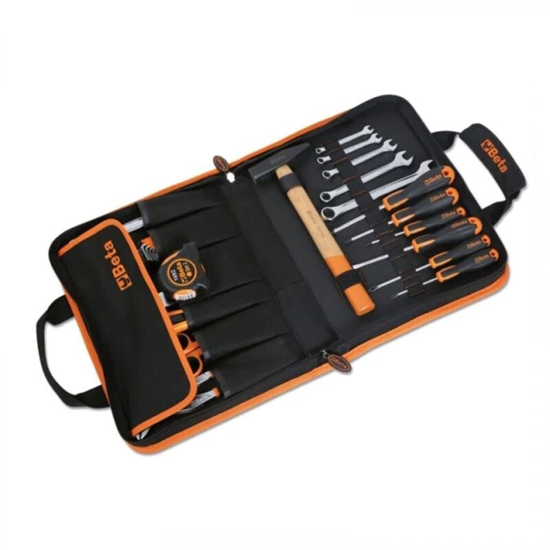 Valigetta pieghevole con assortimento di 27 utensili per interventi universali - Beta 2001/BZ27 VU Valigetta porta attrezzi in tessuto ad alta resistenza con: • Doppia maniglia superiore per una presa ottimale • Ampia tasca frontale porta documenti con chiusura a zip • Fascia velcrata nella parte posteriore per fissare la valigetta alla maniglia dei trolley • 20 pratici vani portautensili (6 tasche e 14 elastici) • Asole porta martello • Possibilità di applicazione della tracolla C9/RT (da ordinare a parte) Caratteristiche: • Dimensioni/peso valigetta: 380x290x60 mm/ 675 g • Assortimento incluso di 27 utensili per interventi universale Cod. Art. 020010157 Beta 2001/BZ27 VU Assortimento di 27 utensili: 1128BMX forbici per elettricisti lame diritte 1 1150 pinza universale 180 mm 1 42 chiavi combinate 7-8-10-13-17-19 mm 6 1201E giravite lama piatta 3x75 - 4x100 - 5,5x150 mm 3 1202E giravite Phillips® PH0x60- PH1x80 - PH2x100 mm 3 96/SC9 chiavi maschio esagonale piegate