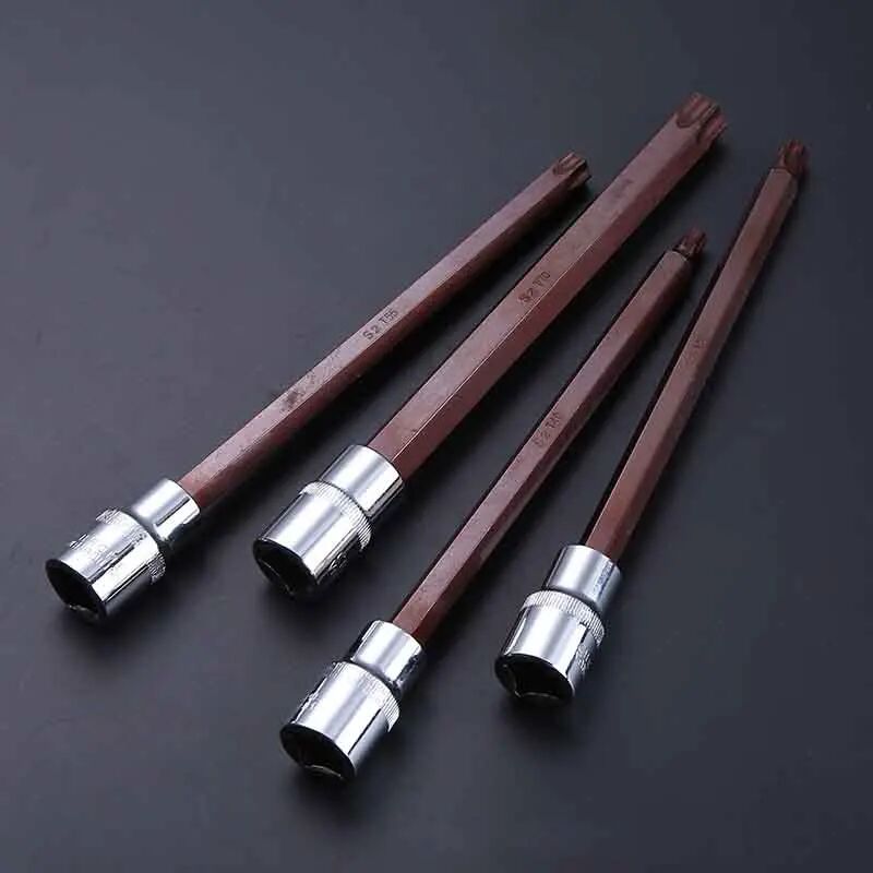 Specifiche: Contenuto della confezione: 1 manicotto per punte Torx Materiale: acciaio al carbonio cromo vanadio, acciaio S2 Colore: tono ottone, Dimensione unità: 1/2 pollice Dimensione punta: T40 T45 T50 T55 Lunghezza totale: 200 mm Lista di imballaggio: 4 pezzi T40 T45 T50 Strumento a bussola T55