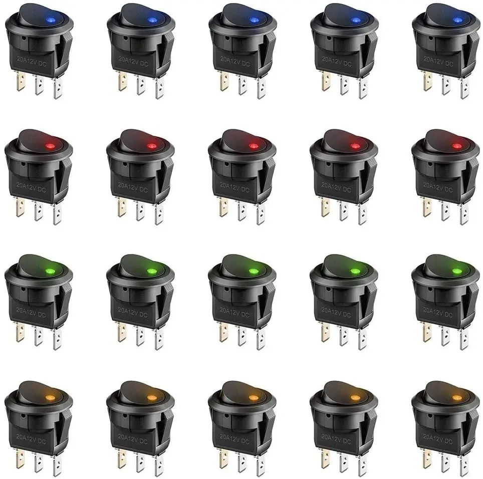 20pcs /lot 3 Pin 12V 20A Amps Car Truck Rocker Round Toggle LED Switch On-Off Control, Blue, Green, Yellow, Red