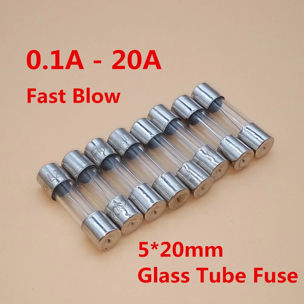 20Pcs/lot 5x20mm Fast Blow Glass Tube Fuse Quick Blow Glass Fuses 250V 0.1A 0.2A 0.5A 1A 2A 3A 3.15A 4A 5A 6A 7A 8A 10A 15A 20A