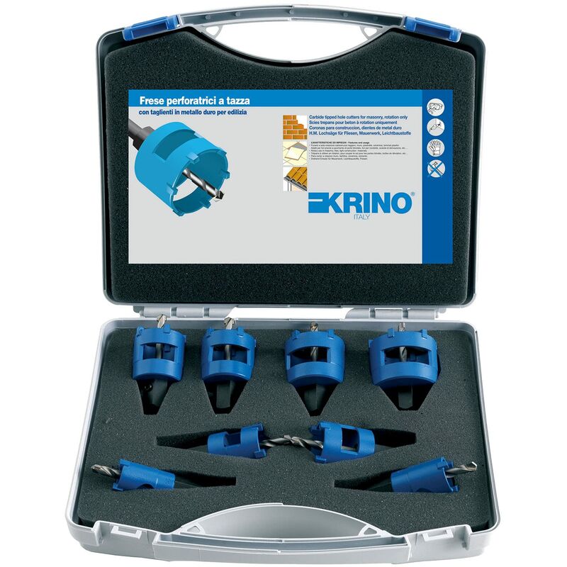 Le frese perforatrici a tazza per edilizia forano solo a rotazione calcestruzzo leggero, muro, piastrelle, ceramica, laminati plastici. Sono adatte per fori precisi a pavimento di porte blindate, fori per condotti, scatole di derivazione. Le frese perforatrici a tazza sono dotate di albero e punta pilota di centraggio. L'altezza della tazza è pari a 40 mm, i denti in metallo duro sono affilati in modo che la tazza possa lavorare a sola rotazione. Il numero di denti è in funzione del diametro della tazza. Krino Group - Krino Spa è stata fondata nel 1982 a Montevecchia, a nord di Milano, specializzato nella produzione utensili da taglio sin dai primi del 1900. Orgogliosa dei riconoscimenti sulla qualità dei propri utensili da taglio per asportazione di truciolo, ha vissuto negli anni una rapida espansione che ha portato alla costruzione, quale polo produttivo e logistico, di una nuova sede a Monticello Brianza. Ciò ha contribuito allo sviluppo e al completamento delle varie linee di