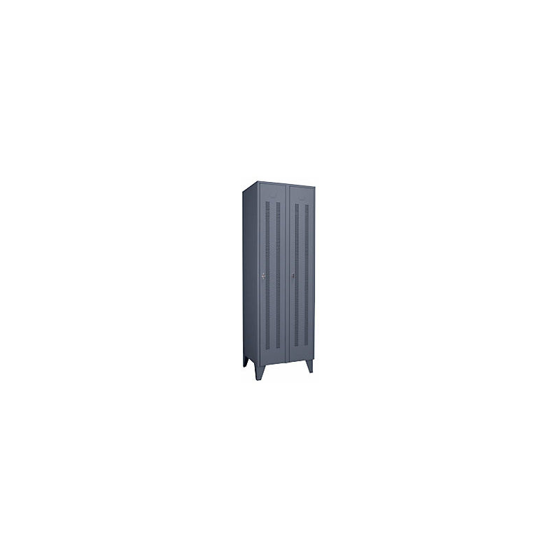 Armadietto in acciaio con piedini, scomparti a tutta altezza, ante forate, larghezza scomparto 300 mm, 2 scomparti, grigio-azzurro. Fornitura = montato. Altezza = 1850 mm. Profondità = 500 mm. Larghezza = 600 mm. Colore corpo = grigioazzurro RAL 7031. Colore porta = grigioazzurro RAL 7031. Serratura = chiavistello girevole. Numero scomparti in larghezza = 2 pz. Larghezza scomparti = 300 mm. Materiale = lamiera d'acciaio. Altezza armadietto = 1850 mm. Dotazione interna = 1 cappelliera, 1 asta appendiabiti, 3 ganci scorrevoli. Larghezza interna = 298 mm. Altezza interna = 300 / 1400 mm. Profondità interna = 475 mm. Tipo di porta = ante forate. Altezza piedini = 150 mm. Struttura = saldata. Superficie = con verniciatura a forno. Robusto armadietto con piedini a norma DIN 4547. Disponibili in varie larghezze e colori. A scelta con ante forate o piene con battuta a destra. Dotazione interna personalizzabile. Fessure di aerazione per una circolazione ottimale dell'aria. Bordo con doppia