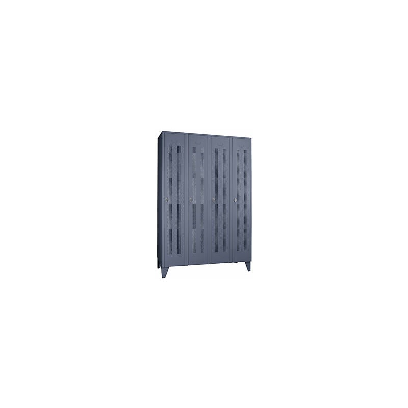 Armadietto in acciaio con piedini, scomparti a tutta altezza, ante forate, larghezza scomparto 300 mm, 4 scomparti, grigio-azzurro. Fornitura = montato. Altezza = 1850 mm. Profondità = 500 mm. Larghezza = 1200 mm. Colore corpo = grigioazzurro RAL 7031. Colore porta = grigioazzurro RAL 7031. Serratura = chiavistello girevole. Numero scomparti in larghezza = 4 pz. Larghezza scomparti = 300 mm. Materiale = lamiera d'acciaio. Altezza armadietto = 1850 mm. Dotazione interna = 1 cappelliera, 1 asta appendiabiti, 3 ganci scorrevoli. Larghezza interna = 298 mm. Altezza interna = 300 / 1400 mm. Profondità interna = 475 mm. Tipo di porta = ante forate. Altezza piedini = 150 mm. Struttura = saldata. Superficie = con verniciatura a forno. Robusto armadietto con piedini a norma DIN 4547. Disponibili in varie larghezze e colori. A scelta con ante forate o piene con battuta a destra. Dotazione interna personalizzabile. Fessure di aerazione per una circolazione ottimale dell'aria. Bordo con doppia