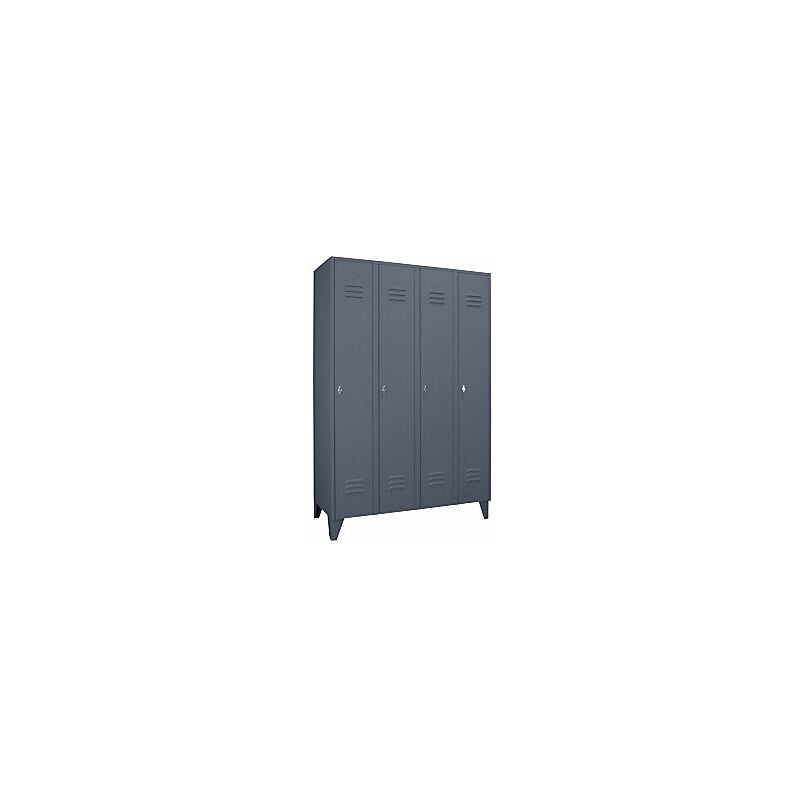 Armadietto in acciaio con piedini, scomparti a tutta altezza, ante piene, larghezza scomparto 300 mm, 4 scomparti, grigio-azzurro. Fornitura = montato. Altezza = 1850 mm. Profondità = 500 mm. Larghezza = 1200 mm. Colore corpo = grigioazzurro RAL 7031. Colore porta = grigioazzurro RAL 7031. Serratura = chiavistello girevole. Numero scomparti in larghezza = 4 pz. Larghezza scomparti = 300 mm. Materiale = lamiera d'acciaio. Altezza armadietto = 1850 mm. Dotazione interna = 1 cappelliera, 1 asta appendiabiti, 3 ganci scorrevoli. Larghezza interna = 298 mm. Altezza interna = 300 / 1400 mm. Profondità interna = 475 mm. Tipo di porta = ante piene. Altezza piedini = 150 mm. Struttura = saldata. Superficie = con verniciatura a forno. Robusto armadietto con piedini a norma DIN 4547. Disponibili in varie larghezze e colori. A scelta con ante forate o piene con battuta a destra. Dotazione interna personalizzabile. Fessure di aerazione per una circolazione ottimale dell'aria. Bordo con doppia