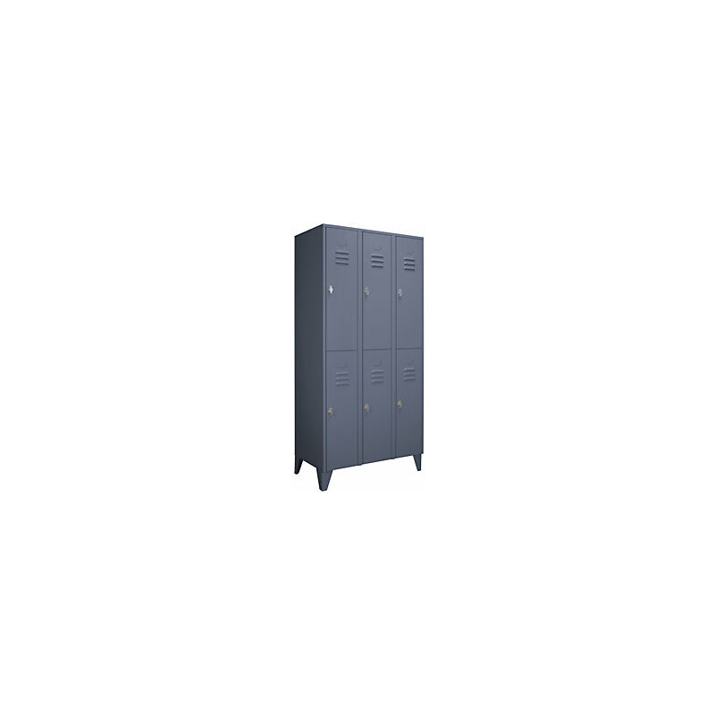 Armadietto in acciaio con piedini, scomparti a metà altezza, ante piene, larghezza scomparti 300 mm, 6 scomparti, grigio-azzurro. Fornitura = montato. Altezza = 1850 mm. Profondità = 500 mm. Larghezza = 900 mm. Colore corpo = grigioazzurro RAL 7031. Colore porta = grigioazzurro RAL 7031. Serratura = chiavistello girevole. Numero scomparti in larghezza = 3 pz. Numero scomparti = 6 pz. Larghezza scomparti = 300 mm. Materiale = lamiera d'acciaio. Altezza armadietto = 1850 mm. Dotazione interna = 1 asta appendiabiti, 3 ganci scorrevoli. Larghezza interna = 298 mm. Altezza interna = 820 mm. Profondità interna = 475 mm. Tipo di porta = ante piene. Altezza scomparti = 820 mm. Larghezza ripiani = 300 mm. Profondità ripiani = 500 mm. Altezza piedini = 150 mm. Struttura = saldata a punti. Superficie = con verniciatura a forno. Robusto armadietto con piedini a norma DIN 4547. Spazio ottimizzato grazie agli scomparti a mezza altezza. Disponibili in varie larghezze e colori. A scelta con ante