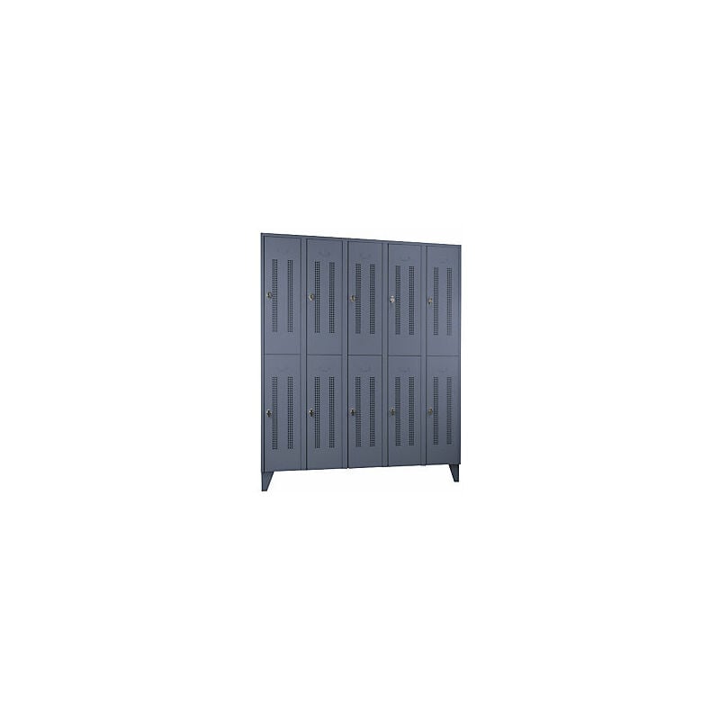 Armadietto in acciaio con piedini, scomparti a metà altezza, ante forate, larghezza scomparti 300 mm, 10 scomparti, grigio-azzurro. Fornitura = montato. Altezza = 1850 mm. Profondità = 500 mm. Larghezza = 1500 mm. Colore corpo = grigioazzurro RAL 7031. Colore porta = grigioazzurro RAL 7031. Serratura = chiavistello girevole. Numero scomparti in larghezza = 5 pz. Numero scomparti = 10 pz. Larghezza scomparti = 300 mm. Materiale = lamiera d'acciaio. Altezza armadietto = 1850 mm. Dotazione interna = 1 asta appendiabiti, 3 ganci scorrevoli. Larghezza interna = 298 mm. Altezza interna = 820 mm. Profondità interna = 475 mm. Tipo di porta = ante forate. Altezza scomparti = 820 mm. Larghezza ripiani = 300 mm. Profondità ripiani = 500 mm. Altezza piedini = 150 mm. Struttura = saldata a punti. Superficie = con verniciatura a forno. Robusto armadietto con piedini a norma DIN 4547. Spazio ottimizzato grazie agli scomparti a mezza altezza. Disponibili in varie larghezze e colori. A scelta con ante