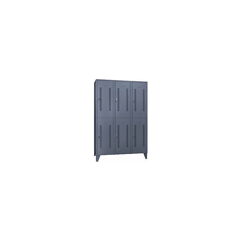 Armadietto in acciaio con piedini, scomparti a metà altezza, ante forate, larghezza scomparti 400 mm, 6 scomparti, grigio-azzurro. Fornitura = montato. Altezza = 1850 mm. Profondità = 500 mm. Larghezza = 1200 mm. Colore corpo = grigioazzurro RAL 7031. Colore porta = grigioazzurro RAL 7031. Serratura = chiavistello girevole. Numero scomparti in larghezza = 3 pz. Numero scomparti = 6 pz. Larghezza scomparti = 400 mm. Materiale = lamiera d'acciaio. Altezza armadietto = 1850 mm. Dotazione interna = 1 asta appendiabiti, 4 ganci scorrevoli. Larghezza interna = 398 mm. Altezza interna = 820 mm. Profondità interna = 475 mm. Tipo di porta = ante forate. Altezza scomparti = 820 mm. Larghezza ripiani = 400 mm. Profondità ripiani = 500 mm. Altezza piedini = 150 mm. Struttura = saldata a punti. Superficie = con verniciatura a forno. Robusto armadietto con piedini a norma DIN 4547. Spazio ottimizzato grazie agli scomparti a mezza altezza. Disponibili in varie larghezze e colori. A scelta con ante