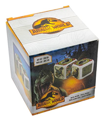 Jurassic World Dominion Sveglia a cubo con luce LED (7 diversi colori), indicazione ora, data, settimana e temperatura