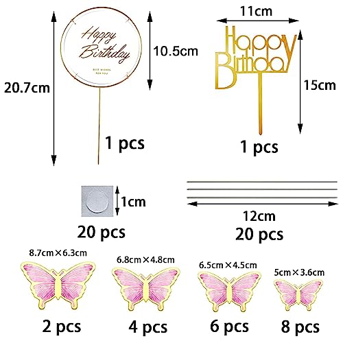 Il pacchetto include: riceverai 20 farfalle decorative (rosa) + 20 bastoncini + 20 punti di colla + 1 pannello di compleanno rotondo in acrilico con cornice in metallo dorato + 1 biglietto di buon compleanno in acrilico, la farfalla è mista Dimensioni, vedere il disegno quotato per i dettagli dimensioni.