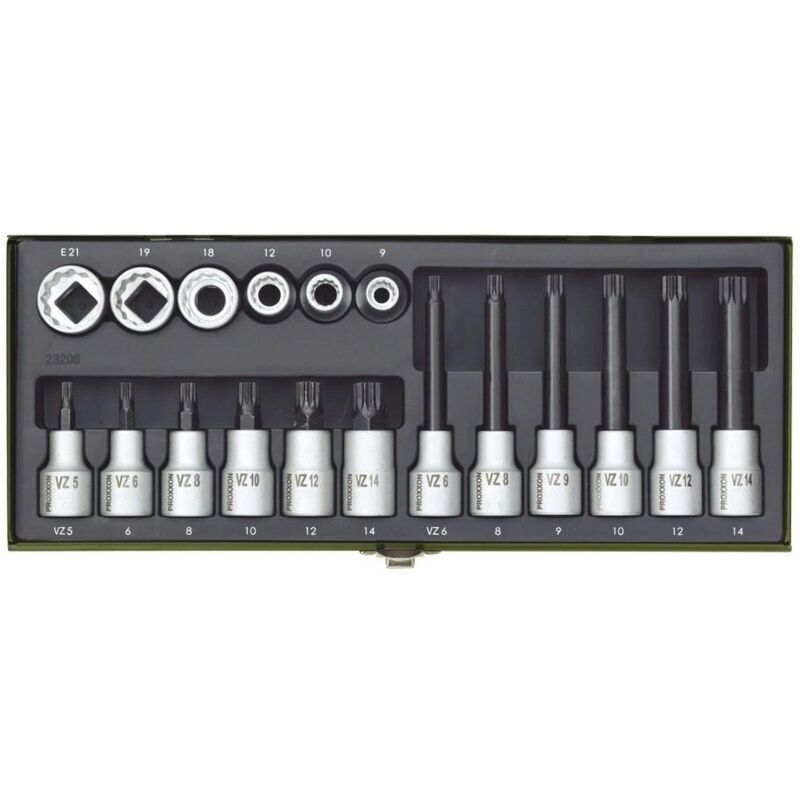 Set di chiavi a bussola. Realizzato in acciaio al cromo vanadio. Serie standard in uno studio cassa in acciaio verniciato a polvere Per la testata del motore, assi cardanici, assi posteriori. In versione normale ed extra lunga.Impronta (cacciavite): 1/2 (12.5 mm) · Materiale: Acciaio al cromo vanadio · Sezione: Multidente XZN, Multidente XZN esterno · Tipo di chiave a bussola (categoria): Kit inserti giravite a bussola...