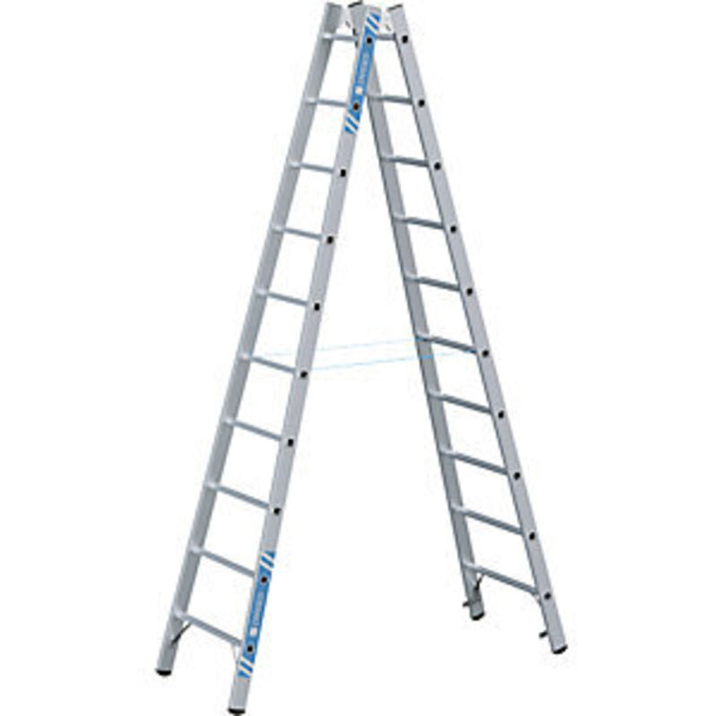 Scala a pioli professionale, salita su ambo i lati, 2 x 10 pioli. Fornitura = montato. Tipo di prodotto = scale a libro con pioli. Salita = su due lati. Versione da salita = pioli. Numero pioli = 2x10 pz. Peso = 11.1 kg. Materiale telaio = alluminio. Materiale gradini = alluminio con rivestimento antisdrucciolo. Altezza verticale = 2830 mm. Profondità gradini = 30 mm. Caratteristiche = pieghevole. Altezza di lavoro = 4050 mm. Portata = 150 kg. Con cerniere in acciaio rinforzate. Montanti e pioli in profilati estrusi di alluminio. Pioli in tubi a sezione quadrata con superficie rigata - triplice flangiatura di robusta e accurata costruzione. I tiranti di rinforzo sui pioli inferiori rendono la scala ancora più stabile. Piedini antiscivolo.