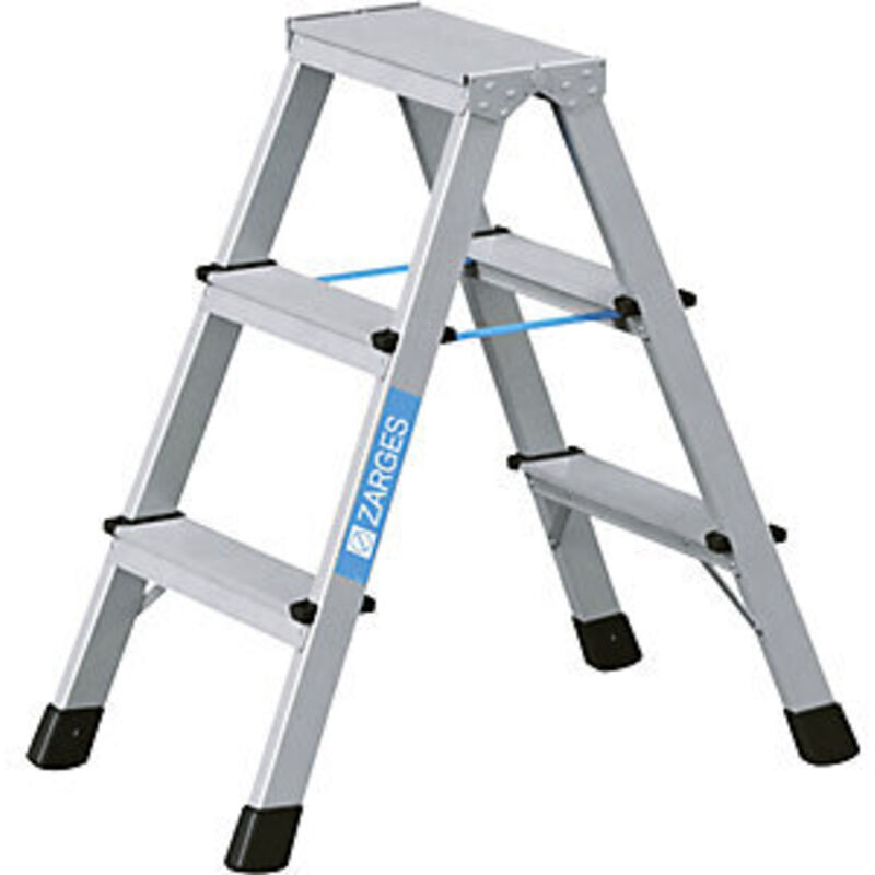 Scala a gradini professionale, anodizzata, salita su ambo i lati, 2 x 3 gradini. Fornitura = montato. Salita = su due lati. Versione da salita = gradini. Numero gradini = 2x3 pz. Materiale telaio = alluminio. Materiale gradini = alluminio con rivestimento antisdrucciolo. Profondità gradini = 80 mm. Peso = 2.6 kg. Caratteristiche = pieghevole. Portata = 150 kg. Altezza verticale = 740 mm. Fissaggio dei gradini ai montanti con rivettatura tripla. Montanti e gradini in profilati estrusi di alluminio. Sicurezza antidivaricamento grazie a cinghie in perlon ad alta resistenza. Assemblaggio dei gradini ai montanti con rivettatura multipla. Tappi in plastica alle estremità. Profondità gradini 80 mm. Ideale per l'uso quotidiano.