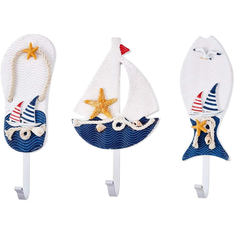 Stile mediterraneo: 3 pezzi meravigliosi ed eleganti ganci a forma di pesce azzurro prussiano, barca a vela e pantofola, freschi e in movimento, fanno sentire alle persone la forte atmosfera del mare. Ganci da parete attraenti: Questo gancio da parete in stile mediterraneo è attraente e adatto per case al mare, case al mare o qualsiasi altro arredamento a tema spiaggia. Struttura robusta: questo appendiabiti da parete è progettato per essere robusto, realizzato in legno di alta qualità, squisito e meticoloso, abbastanza per trasportare cappotti, asciugamani, borse, chiavi e altri piccoli oggetti. Risparmia spazio: usalo in camera da letto, in soggiorno o in qualsiasi altro spazio per risparmiare spazio e tenere in ordine questi luoghi . Ampiamente usato: molto adatto per soggiorno, camera da letto, sala da pranzo, bagno, ufficio, puoi appendere cappelli, cappotti, borse, chiavi, asciugamani e persino accappatoi. Numero di spedizioni: 3 pezzi