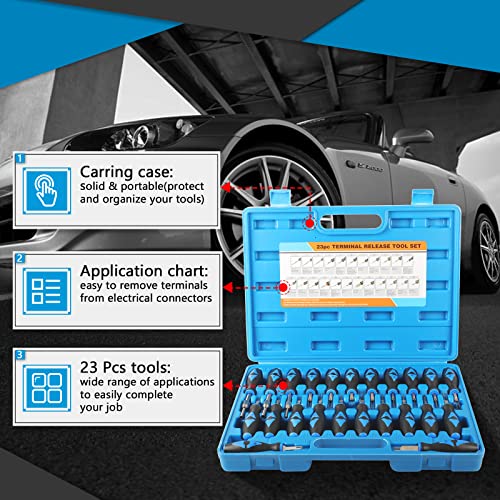 Lavoro efficace: il set di 23 strumenti di rilascio dei terminali rende facile rilasciare i terminali dagli alloggiamenti in plastica senza danni. Questo kit di strumenti terminali può rilasciare perfettamente i terminali dai sensori del refrigerante, dai cavi ai connettori del cablaggio e dalle morsettiere. Il miglior partner indispensabile per la meccatronica e gli elettricisti automobilistici.