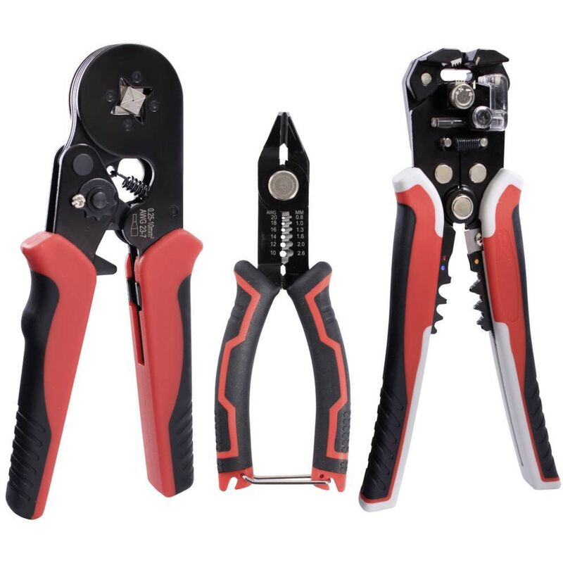 Dettagli tecnici Contenuto 1 KIT Tipo prodotto Kit pinze Pinza spellafili, pinza da taglio, pinza a crimpare Che si tratti di laboratorio, officine, uffici di sviluppo o anche per hobby, tempo libero e formazione, questo set di pinze di alta qualità è sempre ben attrezzato. La pinza a crimpare per capicorda è dotata di un'impostazione automatica del diametro del manicotto in un ampio campo di applicazione tra 0,25 e 10 mm² sezione del conduttore del cavetto, in ogni processo di crimpatura di Neem. L'accessorio a pressione quadrato garantisce un contatto sicuro con un collegamento forte e una qualità elevata costante durante il processo di crimpatura. La pressa a regolazione automatica è calibrata in modo ottimale in fabbrica, ma può essere regolata in base alle esigenze individuali. L'impugnatura ergonomica è ben in mano e consente una buona presa. La pinza è dotata di una chiusura di sicurezza a controllo rapido e di un peso ridotto di soli 363 g per lavorare senza fatica. La pinza