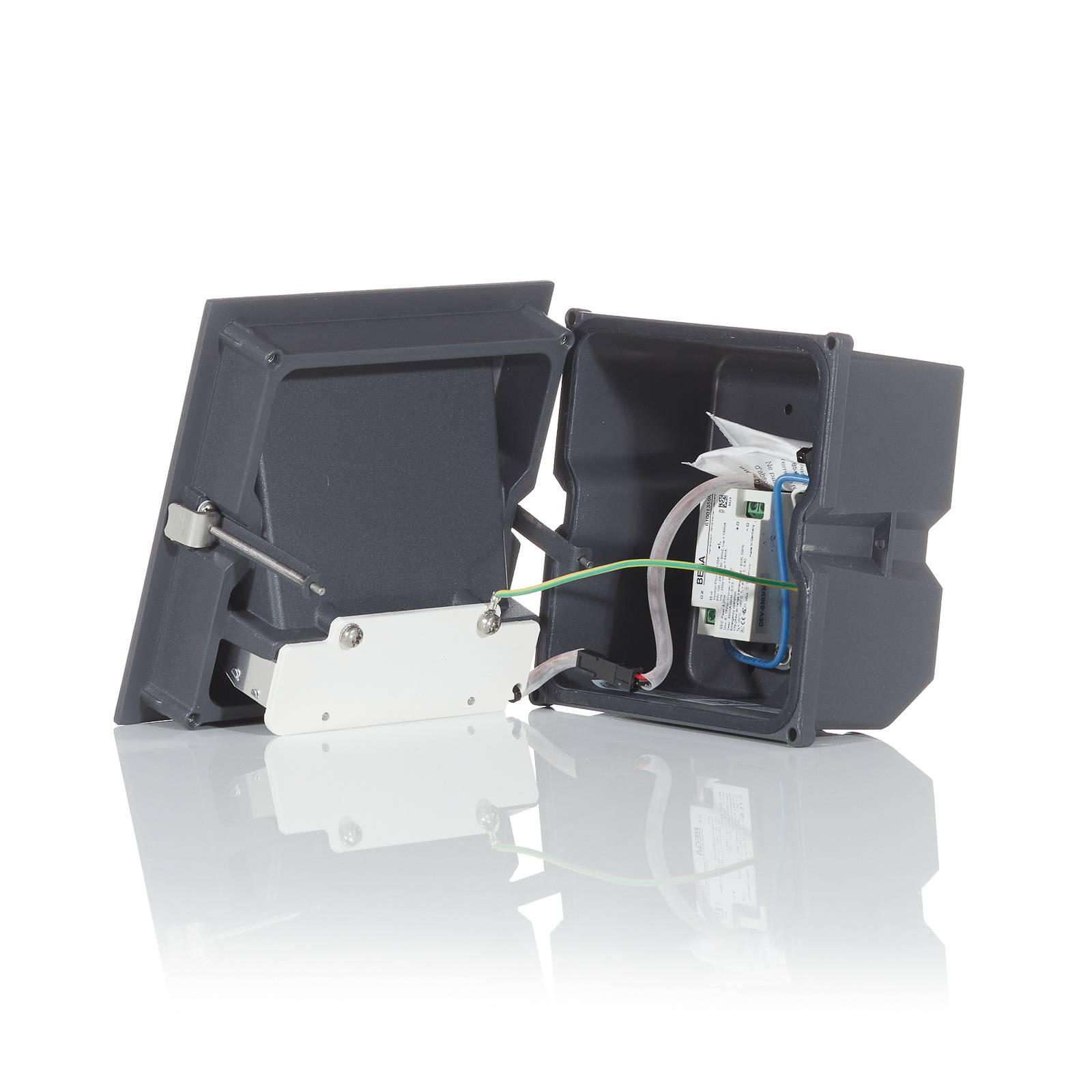 Apparecchio da incasso a parete a LED quadrato in alluminio e acciaio inox Questo apparecchio LED da incasso a parete con luce verso il basso è adatto per il montaggio a filo o a parete. Viene utilizzato per l'illuminazione uniforme e priva di abbagliamento delle superfici del pavimento. Con la sua forma angolare, il colore discreto e le dimensioni discrete, può essere montato su quasi tutte le facciate e le pareti. E' realizzato in alluminio e acciaio inossidabile e ha un vetro di sicurezza con struttura ottica. Questo è incassato al centro come un ripiano inclinato con una superficie scanalata e termina all'interno nella sorgente luminosa a LED. Questo emette una luce bianca calda diretta verso il basso sulle scanalature. La luce non è quindi né inquietante né abbagliante e può essere utilizzata in modo eccellente come luce di orientamento. Il campo di applicazione è variegato e, grazie al grado di protezione IP65, è principalmente all'aperto. Che si tratti di scale, di sentieri intorno agli edifici, di parcheggi o anche di zone d'ingresso, l'apparecchio da incasso fornisce una luce piacevole e affidabile. L'apparecchio è adatto per il cablaggio passante.