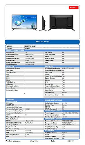 Metz LCD 24MTD1000Z TV 24'' (60cm) LED, HD, Versione 2022, DVB-T2/C/S2 HDTV compatibile HEVC (H265), Dolby Digital Plus, nero [Classe di efficienza energetica F]