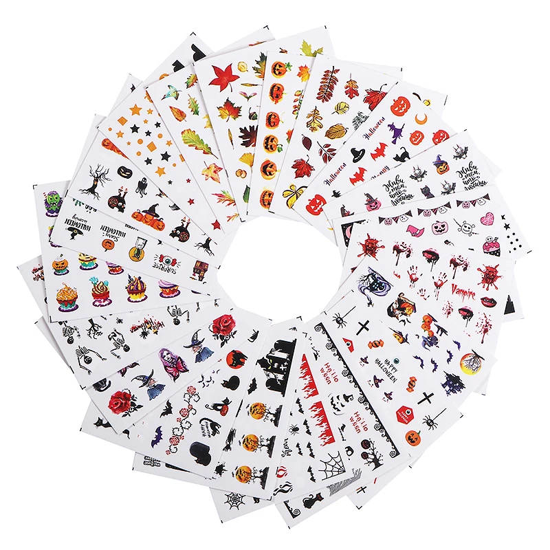 24pcs/set Halloween Nail Stickers Water Transfer Slider Decal Nail Art 3D Decal Sticker Cute Witch Pumpkin Style Decors