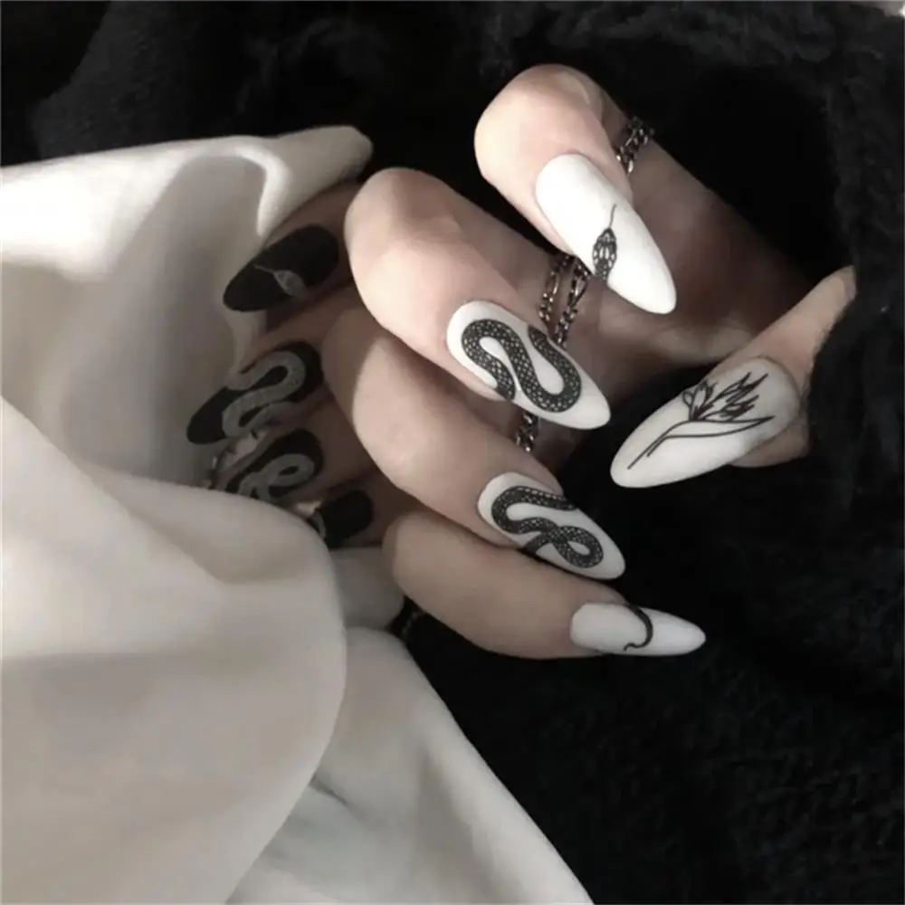 24pcs/set Long Stiletto Fake Nails Punk Snake Pattern Black White Matte False Nails Artificial Full Nail Tips Manicure Tools
