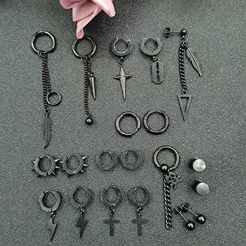 24Pezzi Orecchini da Uomo in Acciaio Inossidabile Orecchini a Cerchio Nero Punk Orecchini Piuma Croce Pendenti Orecchini a Catena Lunghi Ciondoli Orecchini Set Cerchio per Uomo Donna