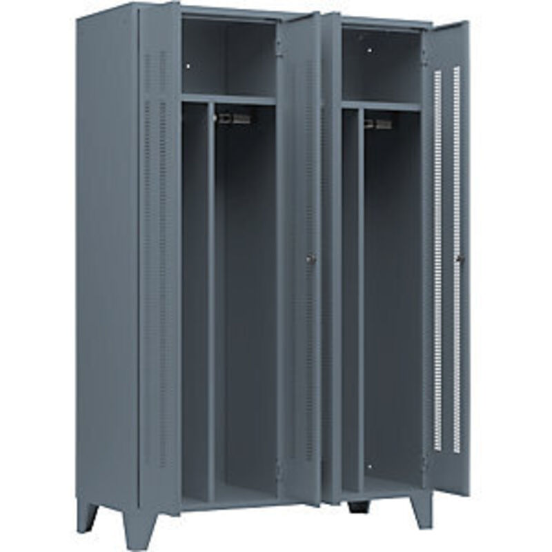 Armadietto in acciaio con piedini, scomparti a tutta altezza, ante forate, larghezza scomparto 600 mm, 2 scomparti, grigio-azzurro. Fornitura = montato. Altezza = 1850 mm. Profondità = 500 mm. Larghezza = 1200 mm. Colore corpo = grigioazzurro RAL 7031. Colore porta = grigioazzurro RAL 7031. Serratura = chiavistello girevole. Numero scomparti in larghezza = 2 pz. Larghezza scomparti = 600 mm. Materiale = lamiera d'acciaio. Altezza armadietto = 1850 mm. Dotazione interna = 1 cappelliera, 1 asta appendiabiti, 6 ganci scorrevoli, parete divisoria centrale fissa. Larghezza interna = 598 mm. Altezza interna = 300 / 1400 mm. Profondità interna = 475 mm. Tipo di porta = ante forate. Altezza piedini = 150 mm. Struttura = saldata. Superficie = con verniciatura a forno. Robusto armadietto con piedini a norma DIN 4547. Disponibili in varie larghezze e colori. A scelta con ante forate o piene con battuta a destra. Dotazione interna personalizzabile. Fessure di aerazione per una circolazione