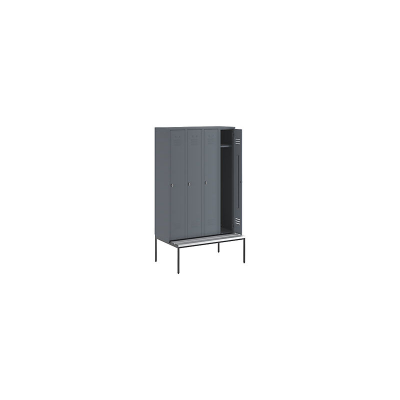 Armadietto guardaroba con panca inferiore integrata, ante piene, larghezza scomparti 300 mm, 4 scomparti, grigio-azzurro. Fornitura = montato. Altezza = 2140 mm. Larghezza = 1200 mm. Profondità = 800 mm. Colore corpo = grigioazzurro RAL 7031. Colore porta = grigioazzurro RAL 7031. Serratura = chiavistello girevole. Numero scomparti in larghezza = 4 pz. Materiale = lamiera d'acciaio saldata. Larghezza scomparti = 300 mm. Profondità scomparti = 500 mm. Dotazione interna = 1 cappelliera, 1 asta appendiabiti con 3 ganci. Altezza sedile = 400 mm. Profondità sedile = 300 mm. Altezza armadio = 1750 mm. Profondità armadio = 500 mm. Tipo di porta = ante piene. Colore doghe = grigio. Colore telaio = nero notte RAL 9005. Serie = BERLIN. Larghezza interna = 298 mm. Altezza interna = 250 / 1420 mm. In robusta lamiera d'acciaio saldata, con rinforzo. Con panca portante. Chiavistello girevole predisposto per lucchetto (diametro staffa 6 - 8 mm max). Doghe in profilati alveolari in WPC di qualità con