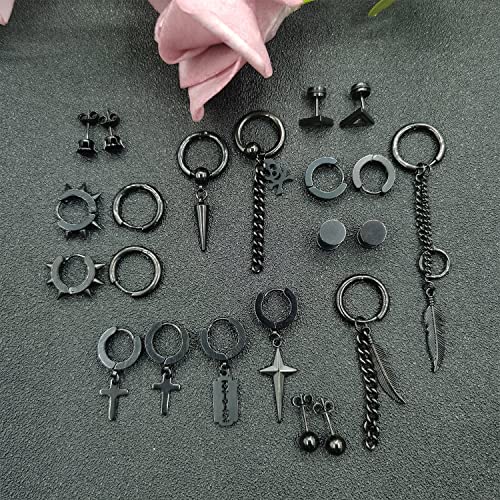 26Pezzi Orecchini da Uomo in Acciaio Inossidabile Orecchini a Cerchio Nero Punk Orecchini Piuma Croce Pendenti Orecchini a Catena Lunghi Ciondoli Orecchini Set Cerchio per Uomo Donna