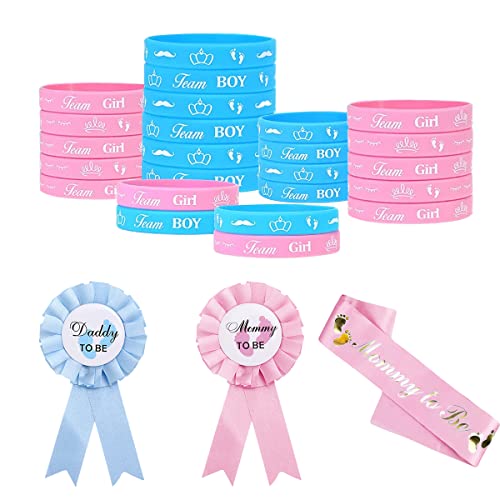27Pcs Set di Giochi per Rivelazione di Genere Include 24Pcs braccialetti in silicone e 2Pcs Genere Rivelare Pulsante Spilla per Baby Doccia Festa Celebrazione, Rosa e Blu
