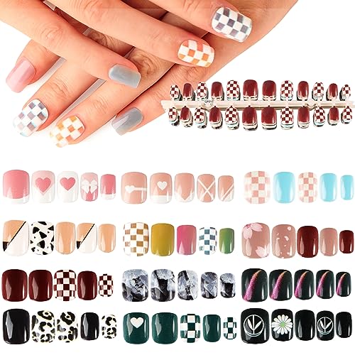 ☮️【Ideale:】Le unghie finte corte quadrate lucide hanno 12 stili: unghie finte arcobaleno, unghie finte leopardate, unghie finte a scacchiera, unghie finte astratte, ecc. Sono multicolori, carine, alla moda e facili da applicare e rimuovere. Sono adatte per casa o salone di bellezza.
