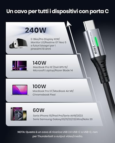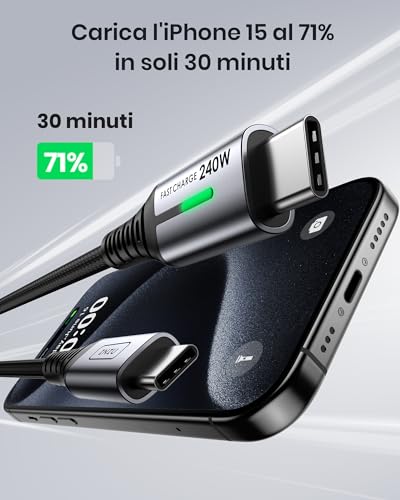 ✅【Ottieni la Velocità di Ricarica più Veloce per iPhone 15】 Sperimenta il futuro della ricarica! Con il nostro cavo USB-C a USB-C da 240W ad alta velocità, la tua serie iPhone 15 raggiunge il sorprendente 71% di batteria in soli 30 minuti. Non farti sfuggire questa rivoluzione nella ricarica!