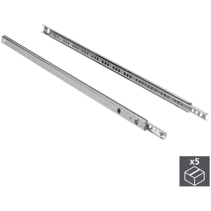 Confezione di 5 coppie (10 pezzi) de guide/binari per cassetto con cuscinetti a sfere ad estrazione parziale singola fabbricate in acciaio zincato. Questo tipo di guida si inserisce dentro una scanalatura di larghezza 17 mm nei fianchi del cassetto. La profondità del cassetto deve essere fra 182-314 mm. Portata massima fino a 10 kg.