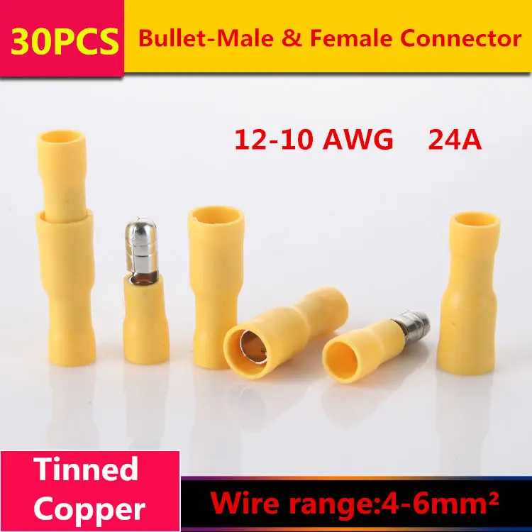 30PCS T019 Bullet-Male & Bullet-Female Quick Disconnect Cable Wire Splice Insulation Terminal Connector 4-6mm2 12-10AWG 24A