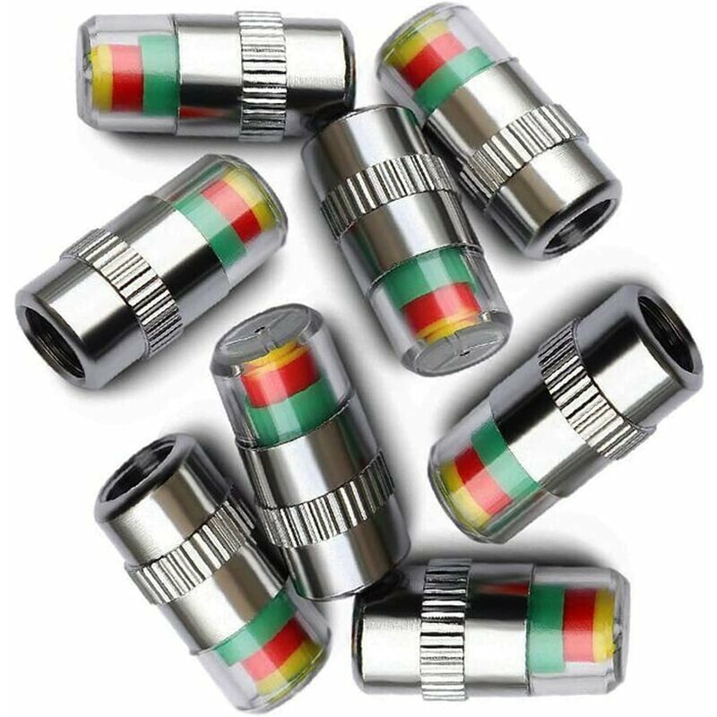 Ti avvisa visivamente quando la pressione dei pneumatici è bassa I cappucci delle valvole del monitor della pressione dei pneumatici per auto aiutano a prevenire l'usura prematura dei pneumatici o gli scoppi dovuti a pneumatici sgonfi, aumentando l'efficienza del carburante, la sicurezza e il controllo, prolungando la durata dei pneumatici Il sistema verde/giallo/rosso indica il corretto livello di gonfiaggio dei pneumatici. In base al colore riconosciuto per mostrare la pressione dei pneumatici, il verde indica che la pressione dei pneumatici è normale Il giallo indica che la pressione è inferiore del 10% rispetto allo standard Il rosso avverte che la pressione è inferiore del 25% rispetto allo standard Adatto per 32 PSI (2,2 bar), applicabile ad auto, moto, biciclette, ecc. AVVERTENZA: Quando si rimuove una copertura. assicurati di non perdere la rondella nera. Tendono a cadere e sono