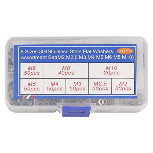360PCS Rondelle Piatte in acciaio inox dell'Assortimento Kit, Rondella di bloccaggio, Rondella piatta per viti di tenuta Anelli di tenuta, 8 Dimensioni (M2/ M2.5/ M3/ M4/ M5 /M6/ M8/ M10)
