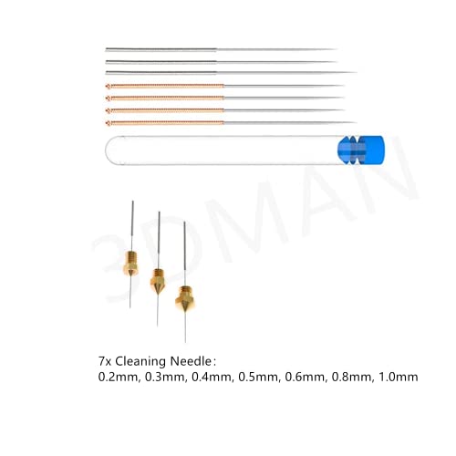 Package Include: Nozzles for E3D Hotend in 7 sizes: 1x 0.2mm, 1x 0.3mm, 1 x 0.4mm, 1 x 0.5mm, 1x 0.6mm, 1x 0.8mm, 1x 1.0mm. 7 x Cleaning Needles: 0. 2mm, 0. 3mm, 0. 4mm, 0. 5mm, 0.6mm, 0.8mm, 1.0mm