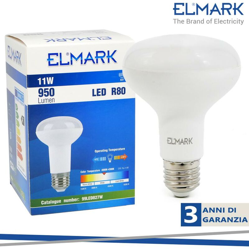 LAMPADA A LED R80 11W E27 230V 4000K CARATTERISTICHE TECNICHE:Modello=LED R80:Tensione nominale=230 V:Potenza=11:Portalampada=E27:Flusso di luce=950:Temperatura di colore=4000K:Angolo di illuminazione=180:Colore della fonte di luce=Bianco:Vita della lampada=30000h:Dimmerabile=No:Dimensione complessiva (mm)=L:112/D:80:Marca=ELMARK