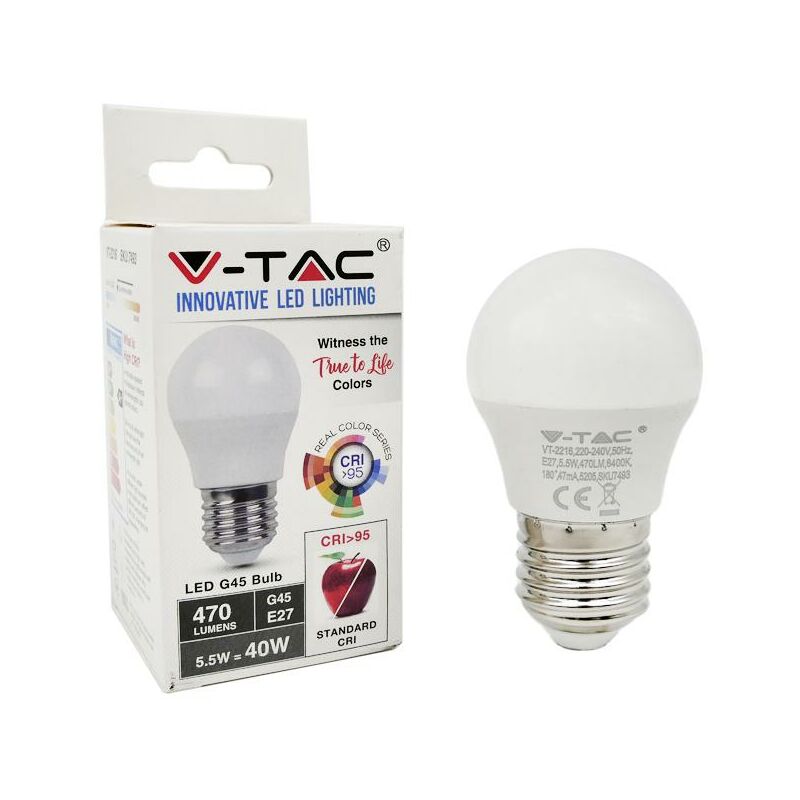 LED Bulb - 5.5W E27 G45 4000K CRI 95+ SKU: 7492: VT: VT-2216 Caratteristiche del prodotto .80% di consumo energetico in meno rispetto alle lampadine standard .Lunga durata .Nessuna emissione di radiazioni UV e radiazioni non ionizzanti .Accensione immediata, nessun tempo di riscaldamento .Bassa potenza termica .Direttamente sostituibile alle lampade ad incandescenza tradizionali Installazione .Aree Commerciali e Residenziali .Hotel, Bar .Stand espositivi .Lampadari .All aperto, esclusivamente all interno di apparecchi idonei. Specifiche tecniche ~: Informazione generale = ~:Attacco=E27~:Tipo Lampadina=G45~:Tipo LED=SMD~:Vita media=30 000 h~: Dati elettrici = ~:Potenza=5.5W~:Potenza EQV. a incandescenza=40W~:Tensione=AC: 220-240V~:Frequenza =50Hz~:Fattore di potenza=>0.5~: Dati tecnici Luce = ~:Colore della luce =Bianco naturale~:Temperatura di colore=4000K~:Flusso luminoso =470 lm~:Indice di resa cromatica Ra=>95~:Fascio Luminoso=180 °~: Dettagli corpo
