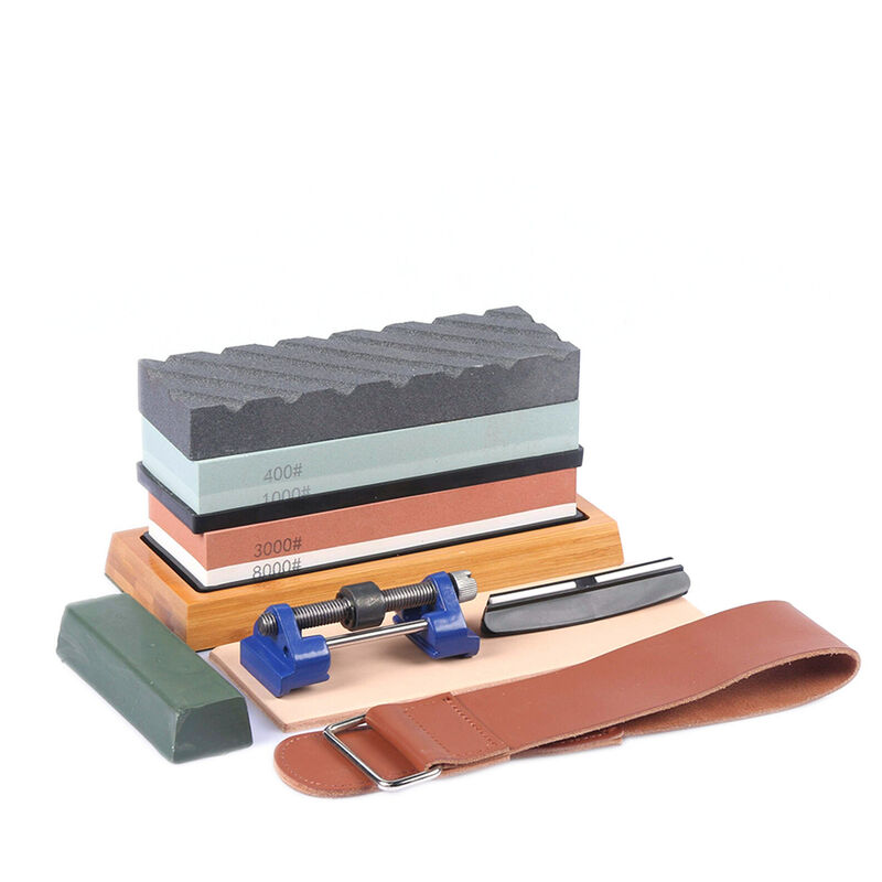 Il set di pietre per affilare comprende pietra per appiattire, pietra per affilare, supporto in silicone, base in bambù, guida angolare, guida per levigatura, coramella in pelle e cera lucidante verde. Il kit è professionale e pratico per affilare qualsiasi lama. Caratteristiche: #3000 per fare un bordo molto appuntito, #8000 per fare un bordo perfetto, #400 per una molatura grossolana, #1000 per riparare piccole fessure e rimuovere sbavature. Realizzato in corindone bianco, quindi non è necessario olio costoso, basta usare un po' d'acqua. La pietra spianatrice per livellare nuovamente le pietre. Non - base in silicone antiscivolo e base in bambù antiscivolo per assicurarsi che la pietra per affilare sia fissata saldamente. rimozione della bava. La cera lucidante verde ti aiuta a ottenere un bordo appuntito come un rasoio più velocemente. Specifiche: Materiale: corindone bianco Peso della confezione: 2550 g 11,22 * 5,39 * 3,74 pollici Lista di imballaggio: 1 * Pietra per appiattire 1