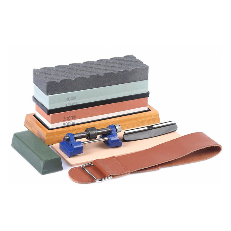 Il set di pietre per affilare comprende una pietra per affilare, una mola, un supporto in silicone, una base in bambù, una guida angolare, una guida per affilare, una pelle e una cera lucidante verde. Il kit è professionale e pratico per affilare qualsiasi lama. Caratteristiche: #3000 per fare bordi molto affilati, #8000 per fare bordi perfettamente, #400 per molatura grossolana, #1000 per riparare piccoli fori e rimozione di sbavature.Realizzato in corindone bianco, quindi non c'è bisogno di olio costoso, basta usare un po' d'acqua. La pietra spianatrice per livellare le pietre. Base in silicone antiscivolo e antiscivolo base in bambù per garantire che la pietra per affilare sia fissata saldamente. L'angolo guida d mantiene la punta del router all'angolazione corretta, la guida per levigatura facilita l'affilatura di scalpelli e lame per pialla. La cera lucidante verde ti aiuta a ottenere un bordo affilato come un rasoio più velocemente. 11,22 * 5,39 * 3,74 pollici Lista di