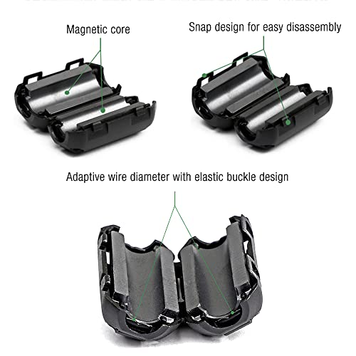 Alta Qualità: i nuclei di ferrite per cavi sono realizzati con alloggiamento in plastica e nucleo di ferrite e il morsetto autoregolante interno può essere fissato saldamente ai cavi e funzionare a lungo.