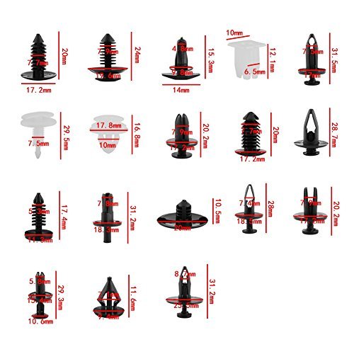 KIT DI MISURA UNIVERSALE: Pacchetto compreso formati multipli auto tagliare clip rivetti tra 415pcs totali per la maggior parte degli usi, ideale per rivestimenti delle portiere, scudo radiatore e paraspruzzi, sul paraurti, stampaggio, pannello laterale, montaggio, porta passaruota ecc, per Ford, Nissan e più.