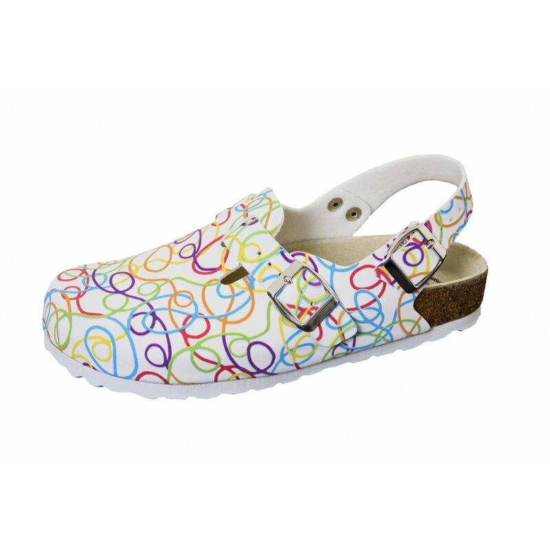 Zoccoli da donna Bio-Donnen-Clogs con cinturino rigido sul tallone, plantare imbottito in sughero naturale, suola antiscivolo, scarpe da lavoro ideali, tomaia in similpelle con motivo stampato.