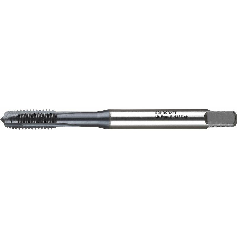 Forma B = 4 - 5 marce, taglio con taglio sbucciato per fori passanti, durezza della superficie circa 3500 HV, appositamente progettato per la lavorazione a secco. Per acciaio dolce fino a 800 N/mm², acciaio automatico fino a 1000 N/mm², acciaio compensato fino a 1200 N/mm², ghisa e ghisa grigia, resistente a temperature fino a 600 °C. M = filettatura metrica ISO secondo DIN 13. Adatto anche per la lavorazione a secco.