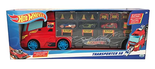 ODS 42034 Hot Wheels Transporter 50, Valigetta Bisarca con 4 Auto Originali, blu
