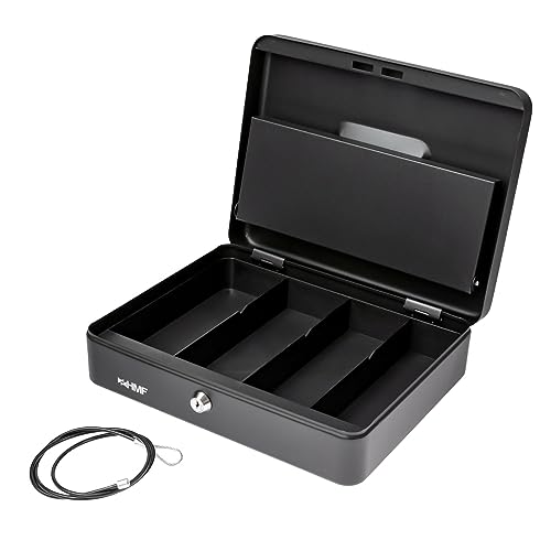 Pratica cassetta portavalori con serratura a cilindro, manico e cavo in acciaio per un fissaggio sicuro